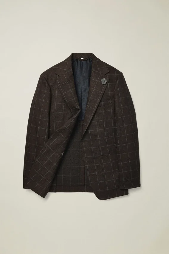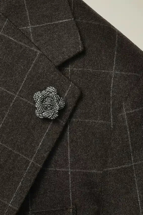 Tessuto in lana e cashmere di alta qualità proveniente dal lanificio italiano di Tollegno | Spilla floreale sul bavero realizzata con scarti di tessuto Donegal | Mezza fodera in jacquard personalizzato | Fodera delle maniche in Bemberg | Tasche interne con bottoni in vera madreperla| Cuciture a punto croce su tutto il capo | Bottoni in vero corno | Bottoni non funzionali sui polsini | Spacchi posteriori