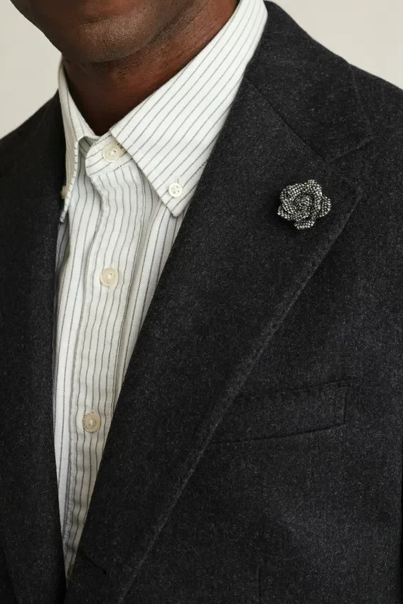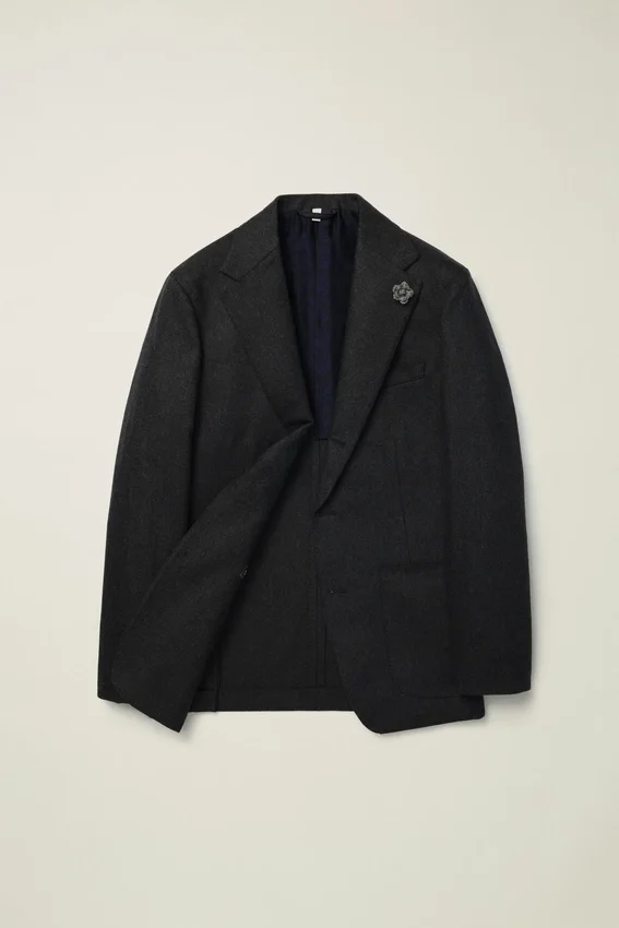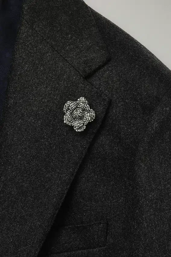 Tessuto in lana e cashmere di alta qualità proveniente dal lanificio italiano di Tollegno | Spilla floreale sul bavero realizzata con scarti di tessuto Donegal | Mezza fodera in jacquard personalizzato | Fodera delle maniche in Bemberg | Tasche interne con bottoni in vera madreperla| Cuciture a punto croce su tutto il capo | Bottoni in vero corno | Bottoni non funzionali sui polsini | Spacchi posteriori