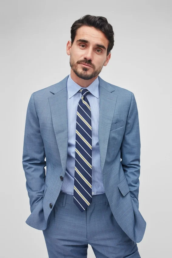 Il modello è alto 188 cm, ha un torace di 102 cm e indossa una giacca da completo 40R.