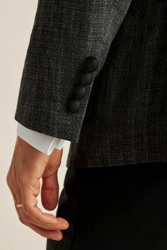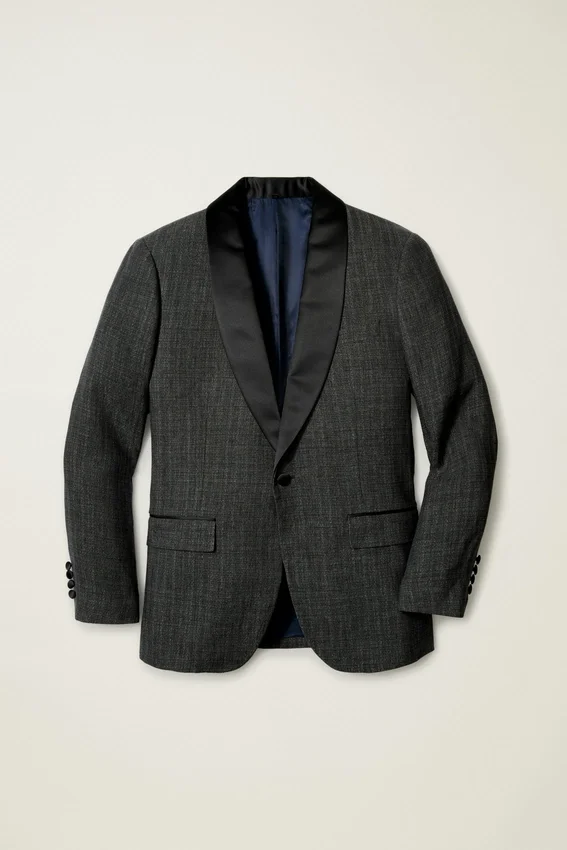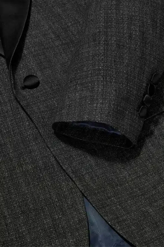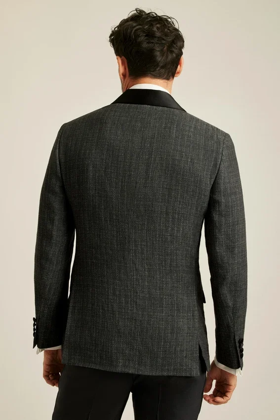 Colletto a scialle | Un solo bottone sul davanti | Revers in raso a contrasto | Tasche con patta | Interno completamente foderato | Spacchi posteriori | Bottoni ricoperti
