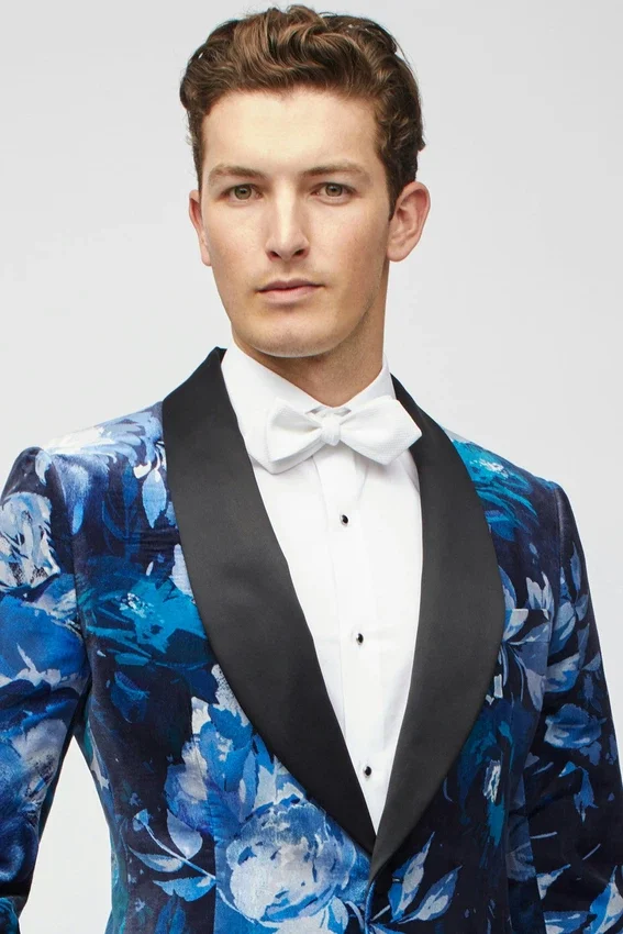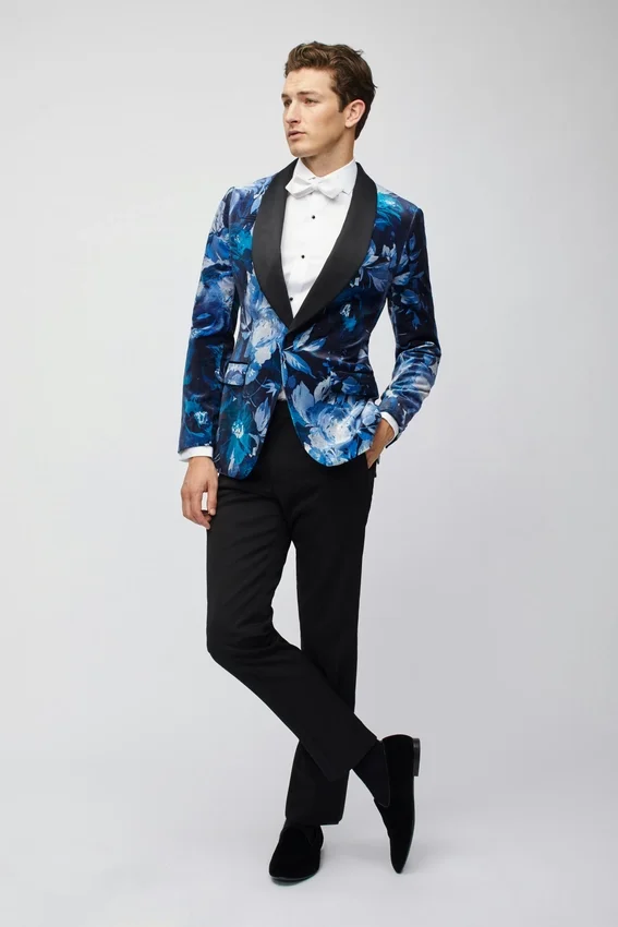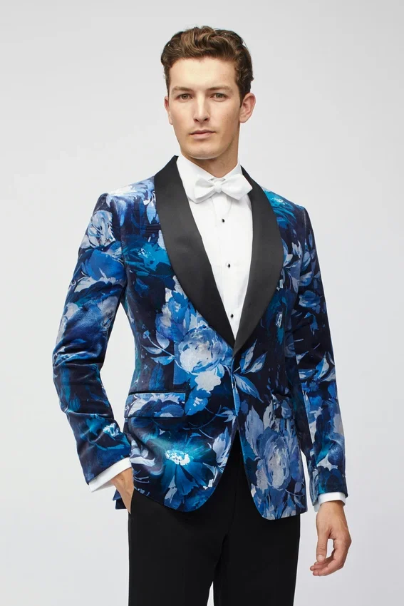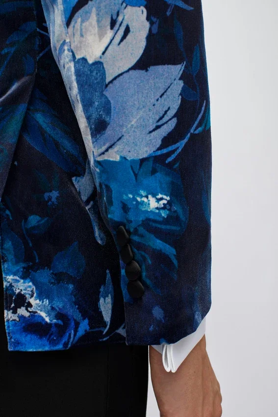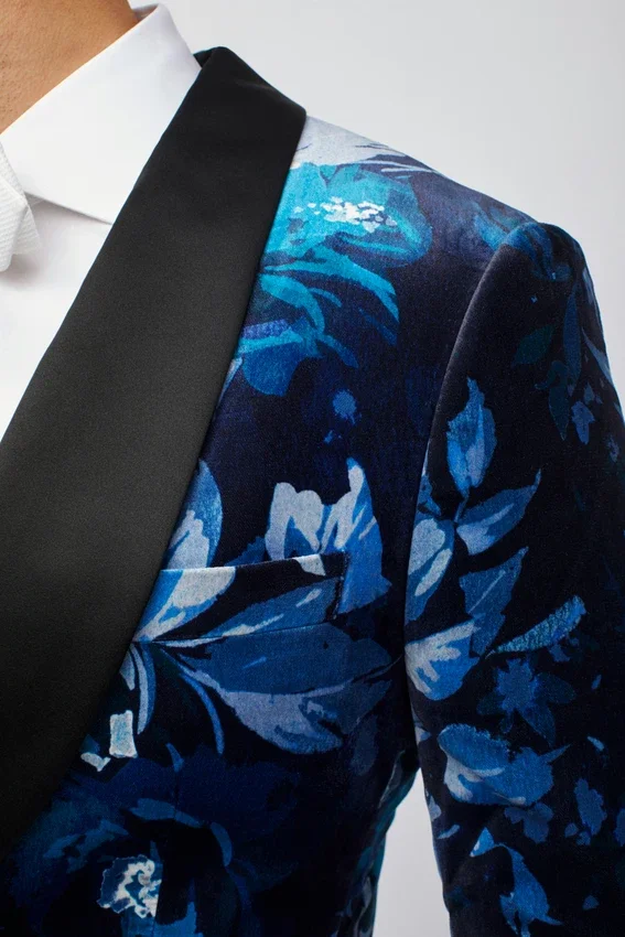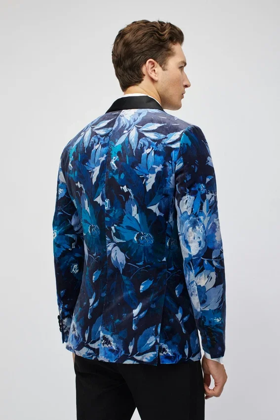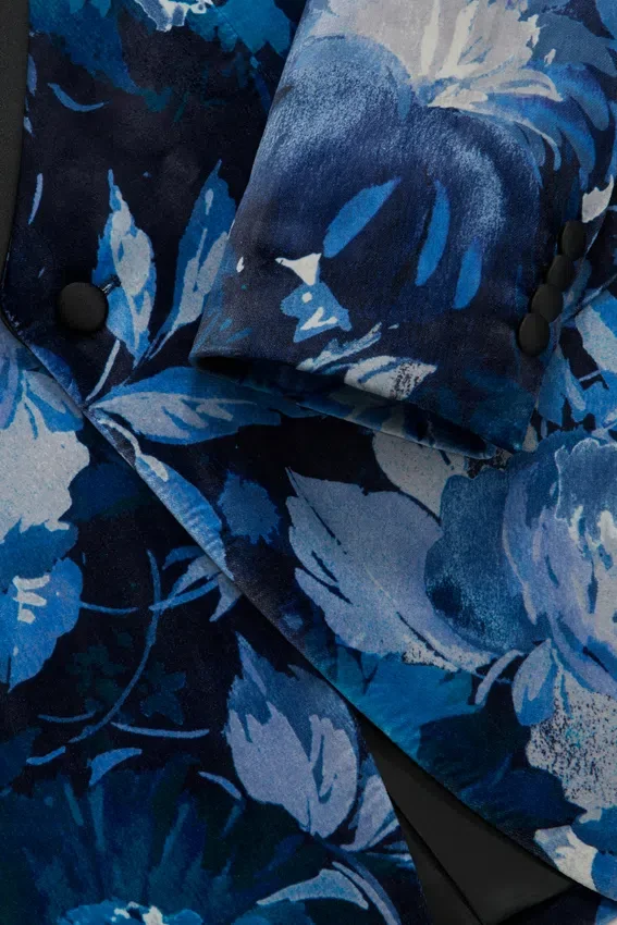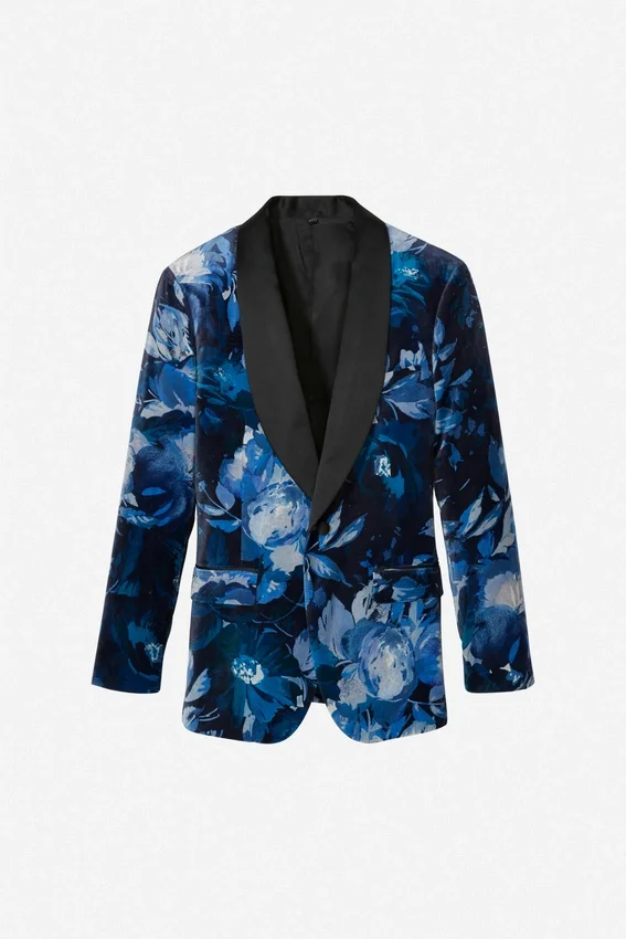 | color | Giacca da smoking Jude in velluto blu con collo a scialle e motivo floreale |