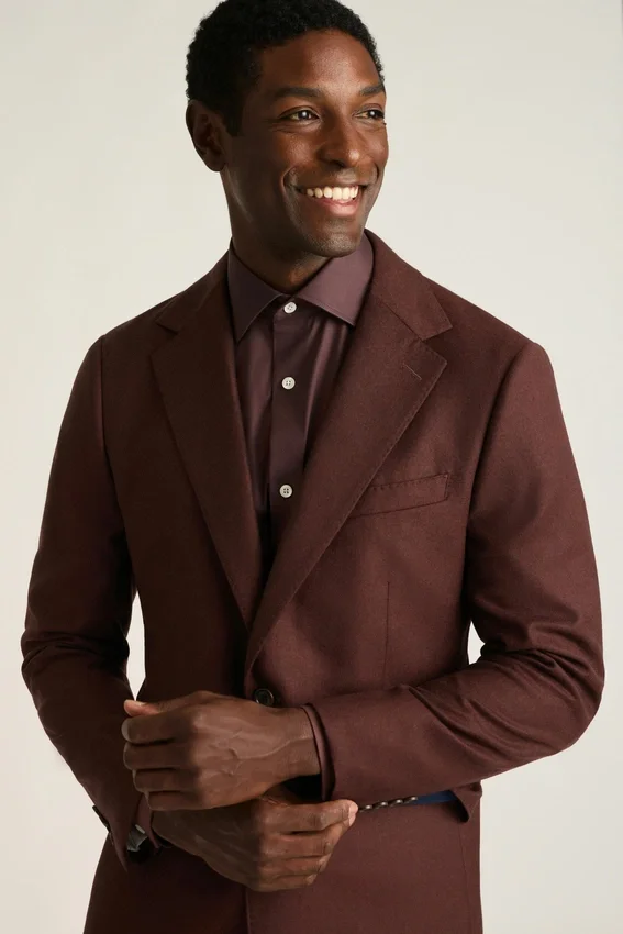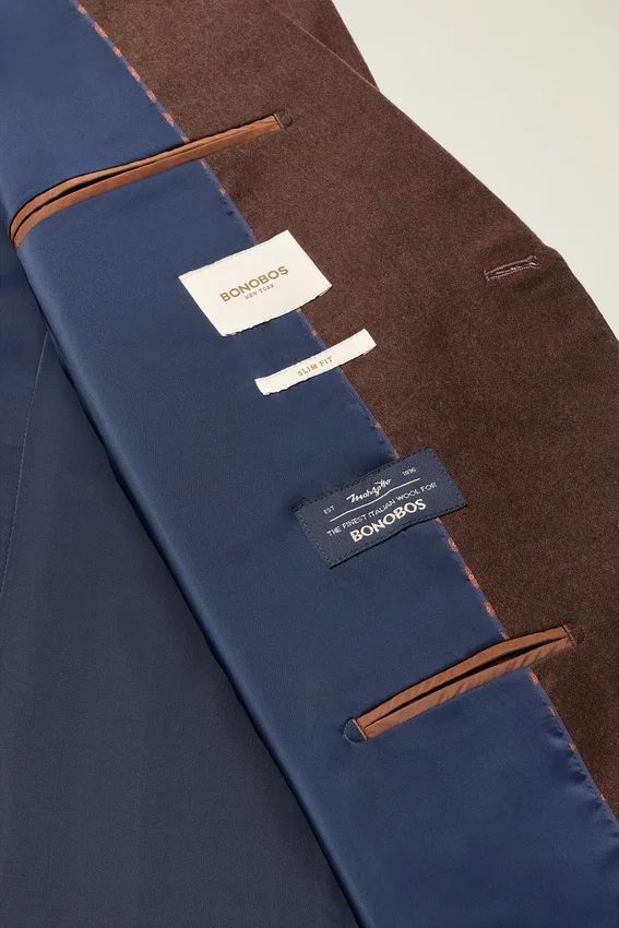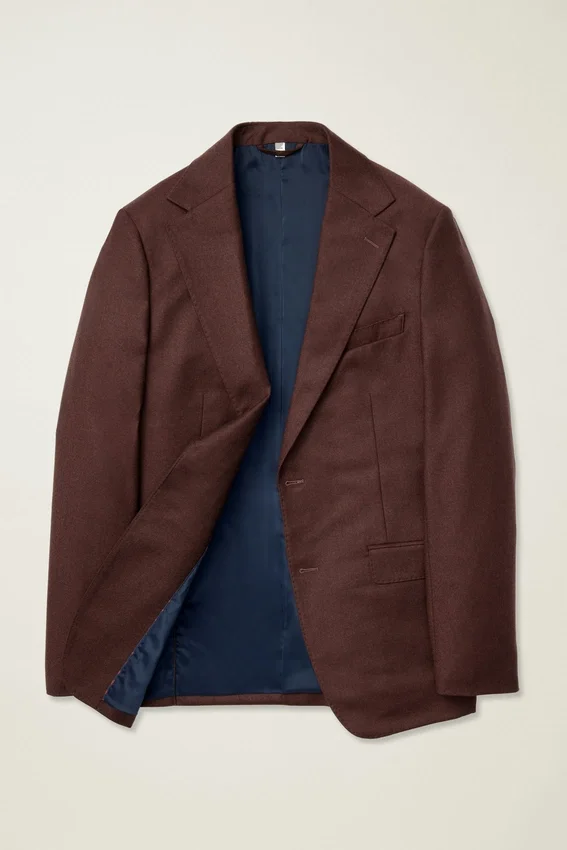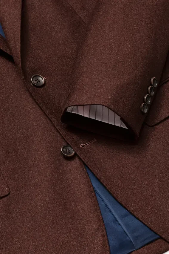 Tessuto Marzotto | Revers a V | Chiusura frontale a due bottoni | Cuciture a punto croce su colletto, revers e patte delle tasche | Interno completamente foderato | Maniche foderate | Tasche con patta in vita | Tasca sul petto | Tasche interne | Spacchi posteriori