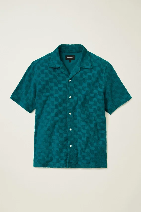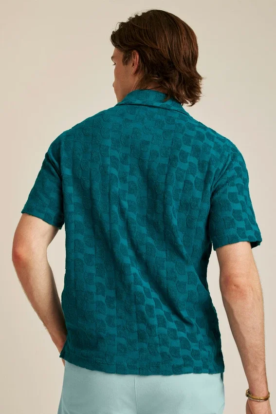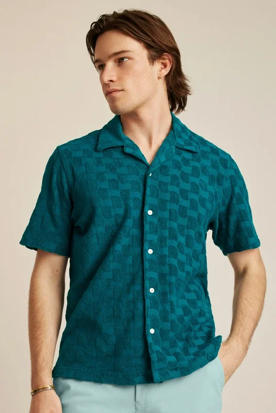 Retro, rilassata e affascinante in tessuto felpato simile a un asciugamano. Una festa a bordo piscina sotto forma di camicia.