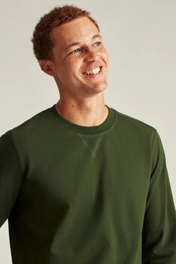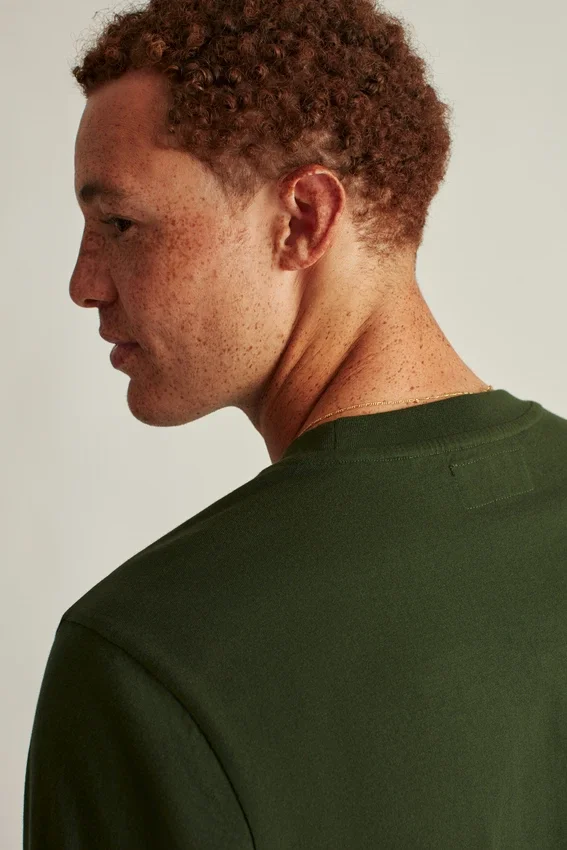 Tessuto jersey di peso medio in cotone morbido e traspirante | Cucitura a copertura Dorito | Bordo del collo a costine | Tessuto a contrasto all’interno del collo posteriore
