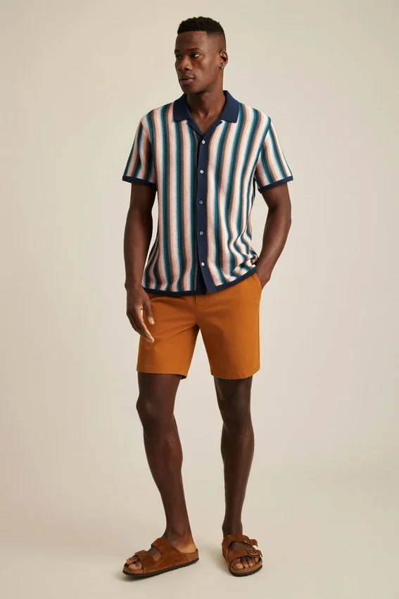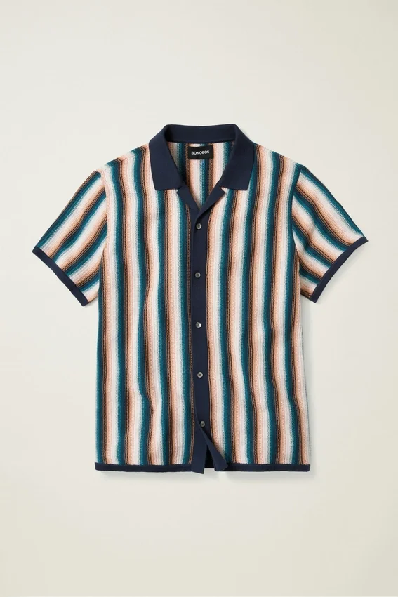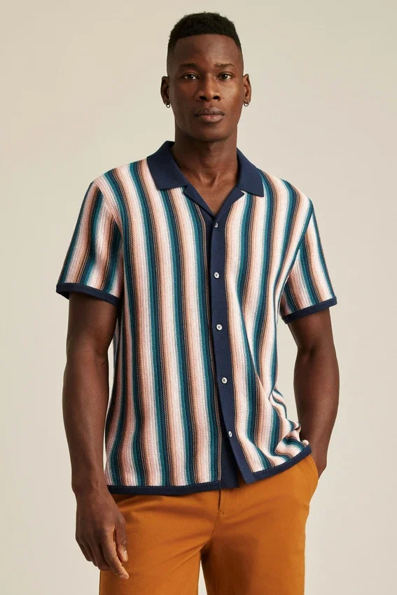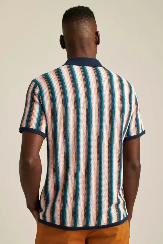 Filato di cotone morbido e traspirante in silhouette con abbottonatura completa e strisce verticali testurizzate per un look alla moda e retrò.
