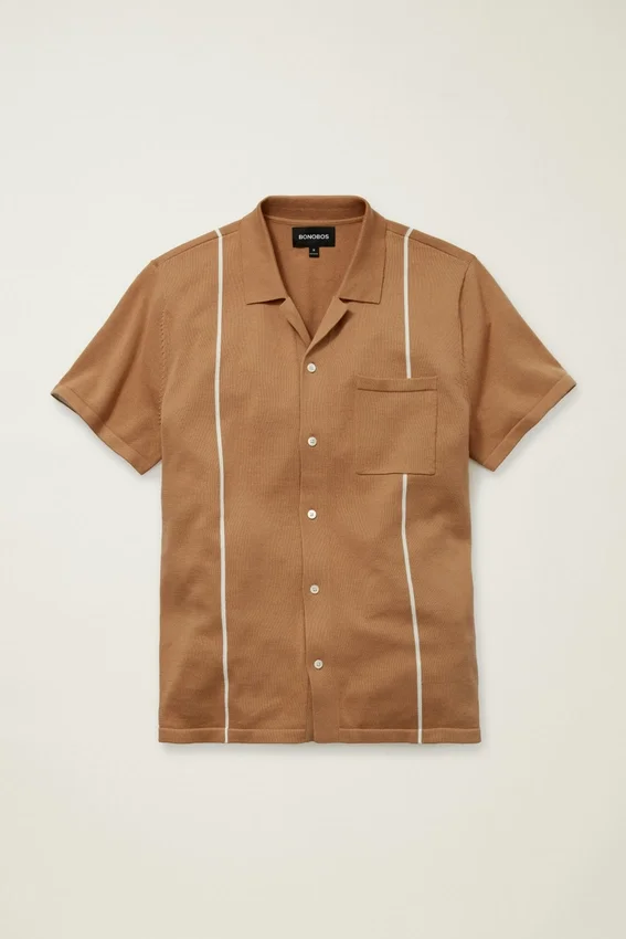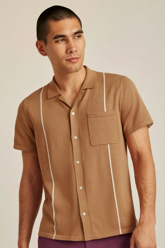 Filato di cotone morbido e traspirante in una silhouette con abbottonatura completa, strisce verticali e tasca sul petto a sinistra per un look alla moda e un’atmosfera retrò.