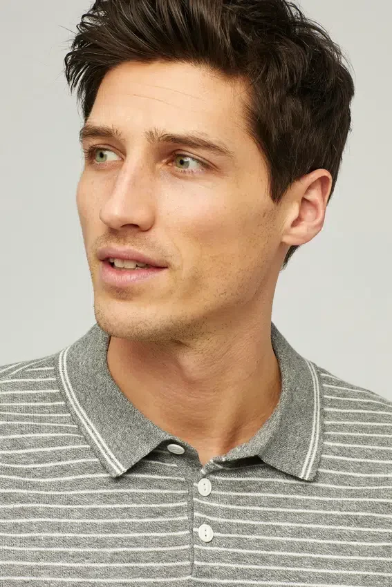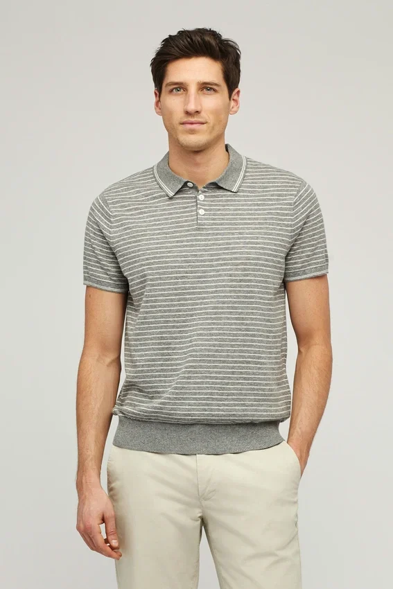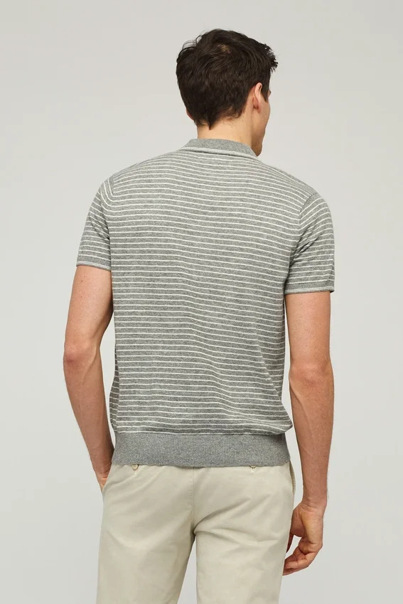 Filato leggero e traspirante in cotone e lino | Righe tinte in filo | Collo a costine 1X1 con abbottonatura aperta