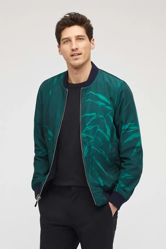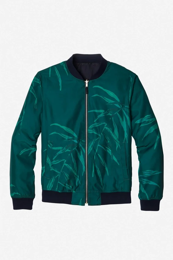 Bomber stampato completamente reversibile. Interno in tinta unita blu navy. Collo e orlo a costine. Tasche a filetto singole.