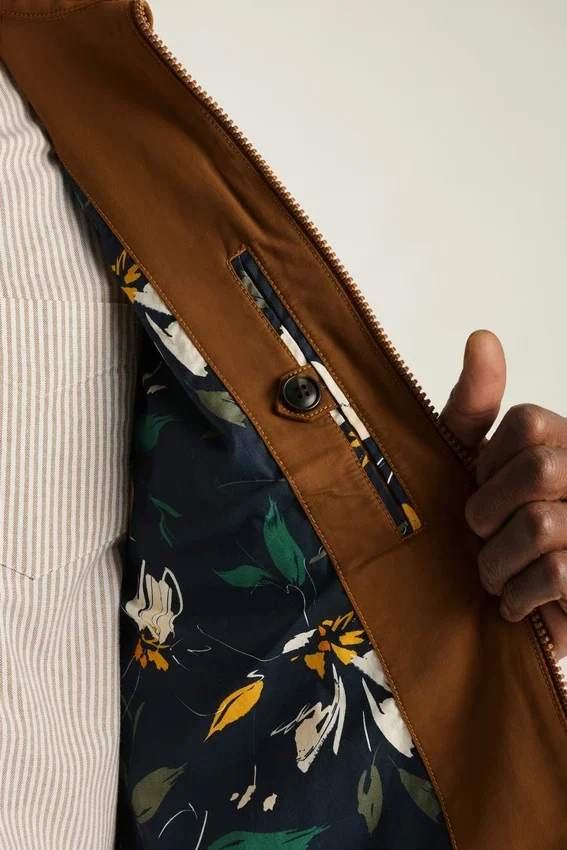 Tessuto resistente all’acqua | Cerniera frontale | Tasca a filetto con cerniera sul petto | Tasche in vita | Elastico sull’orlo laterale | Interno completamente foderato | Tasche interne | Passante interno