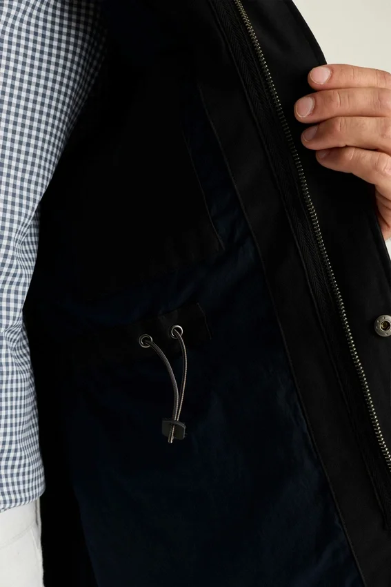 Tasche applicate sul petto e in vita con chiusura a bottoni automatici | Chiusura frontale centrale con bottoni automatici e cerniera | Cordino in vita interno | Tasca interna | Gancio per appendere | Interno completamente foderato