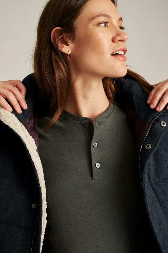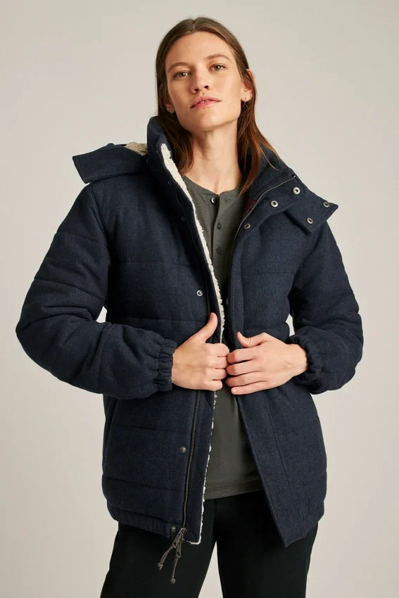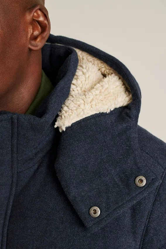 Lana italiana | Imbottitura in Primaloft per il calore | Cappuccio rimovibile | Chiusura frontale a bottoni a pressione | Cerniera a doppio cursore sul davanti | Cappuccio e tasche foderati in sherpa | Ampie tasche interne | Passante interno per appendere | Lana idrorepellente