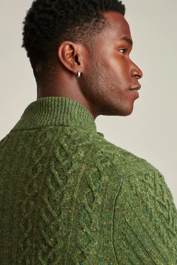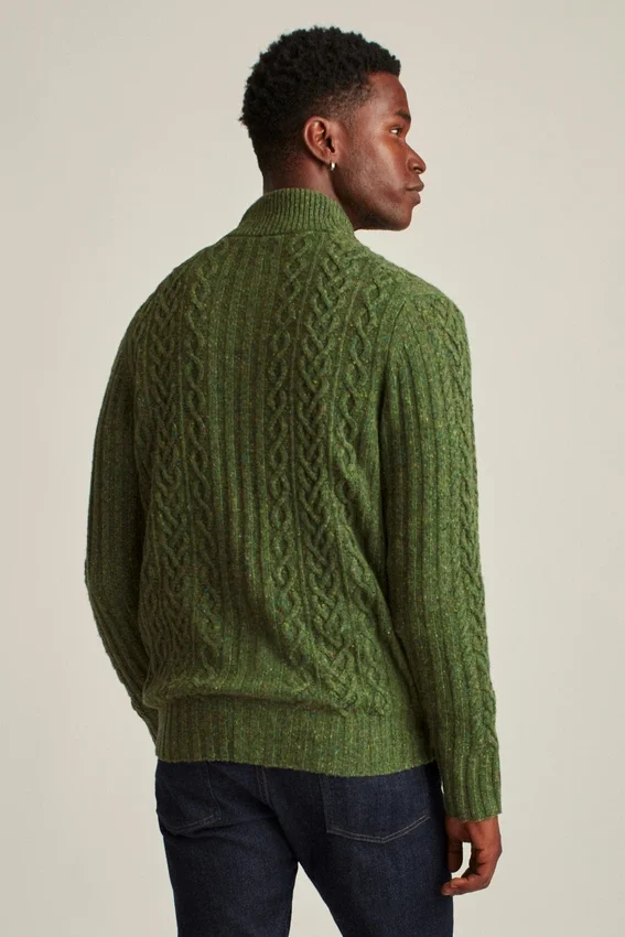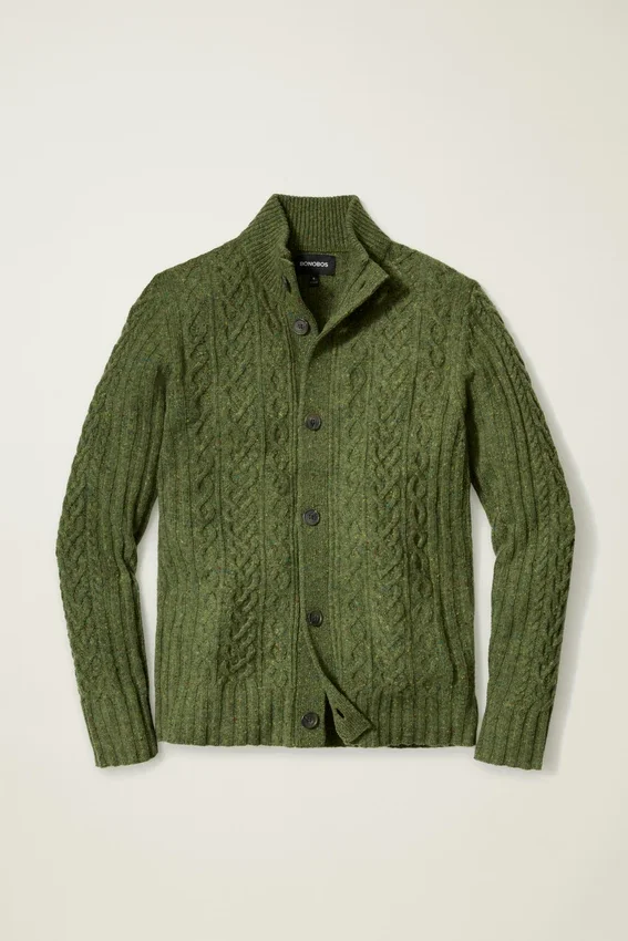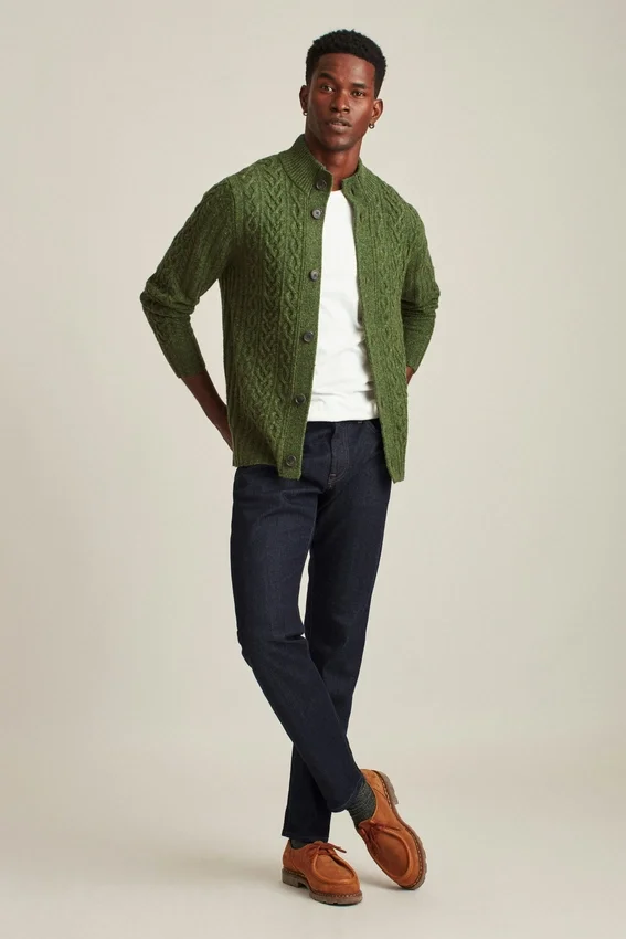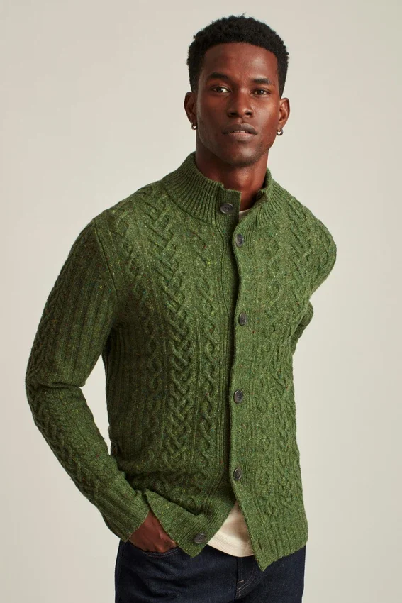 Morbido filato misto lana Donegal in un cardigan con collo a imbuto e lavorazione a trecce su tutta la superficie. Chiusura con bottoni.