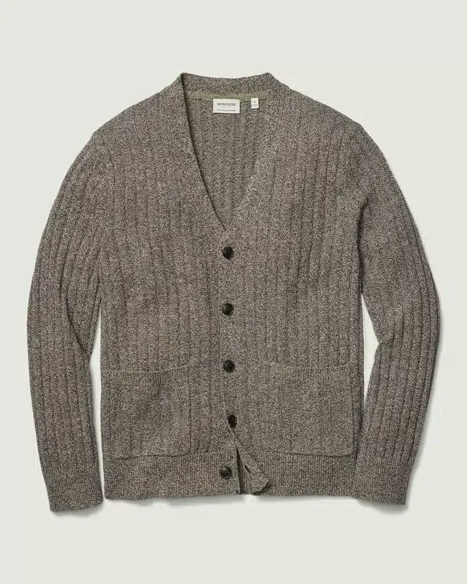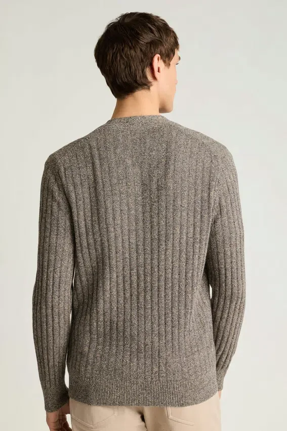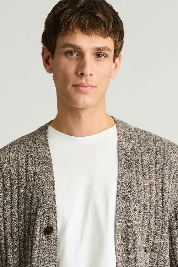 Filato misto lino e cotone italiano | Il filato è ritorto con due colori diversi per un effetto alto-basso | Maglia a coste pescatore | Tasche applicate | Chiusura con bottoni