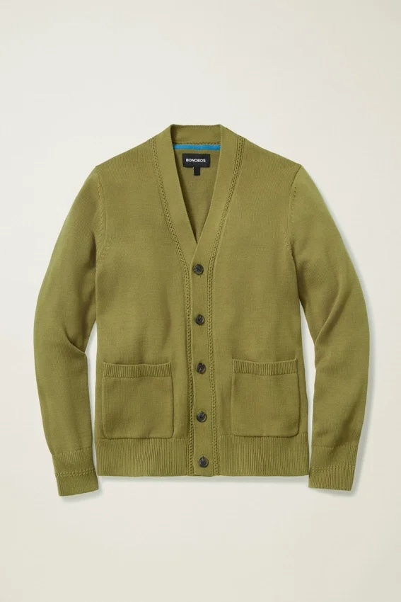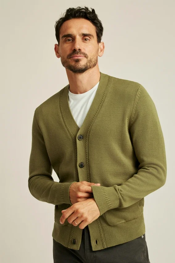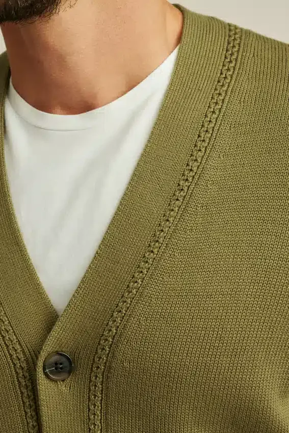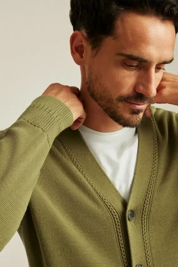 Filato di cotone morbido e traspirante in jersey di peso medio, perfetto per essere indossato in autunno. I dettagli curati includono motivi a treccia accanto all’abbottonatura e sui polsini a costine. Chiusura con bottoni, tasche applicate.