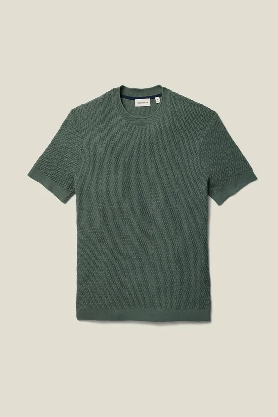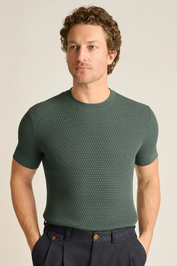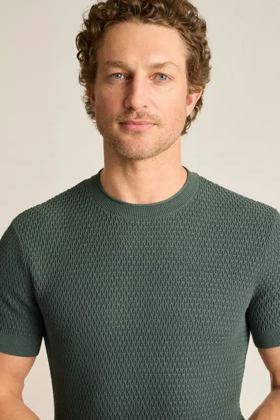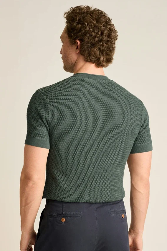 Filato di cotone morbido e traspirante | Maglia a trama irregolare su tutta la superficie | Girocollo con bordo arrotolato | Bordi a costine | Maniche corte | Leggero