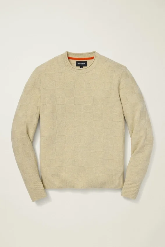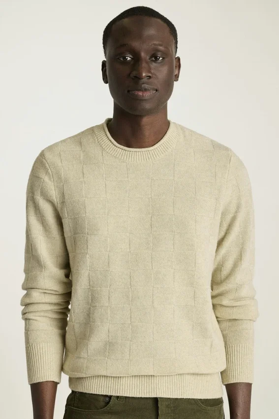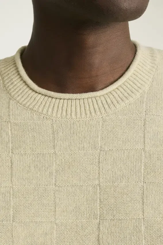 Filato misto merino | Maglia a griglia su tutta la superficie | Girocollo con bordo arrotolato | Bordi a costine