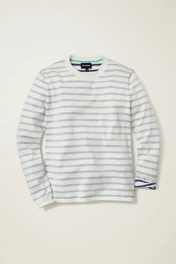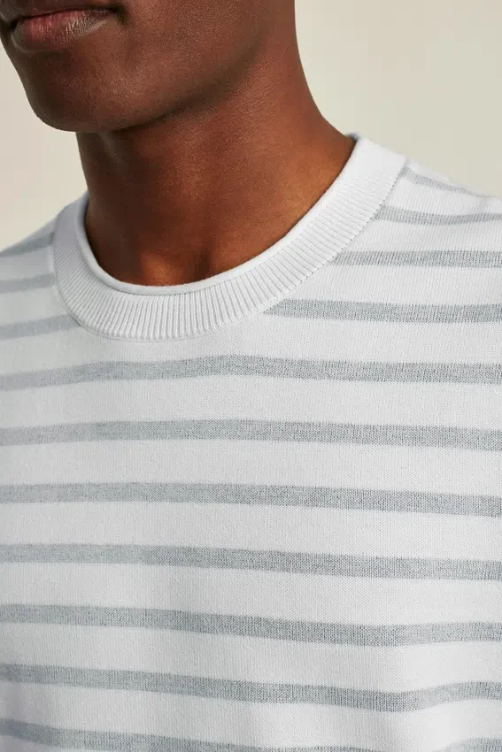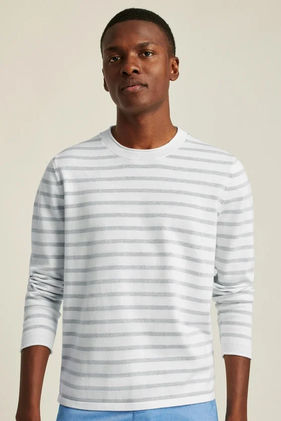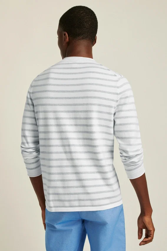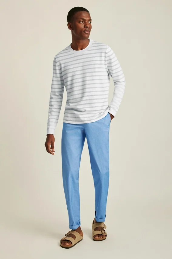 Filato di cotone morbido e traspirante per il corpo della camicia a maniche lunghe. Le strisce tinte in filo sono sovrapposte a filato bianco per un effetto sbiadito dal sole. Il collo a rotolo in jersey e i dettagli su collo e polsini conferiscono un’atmosfera estiva casual.