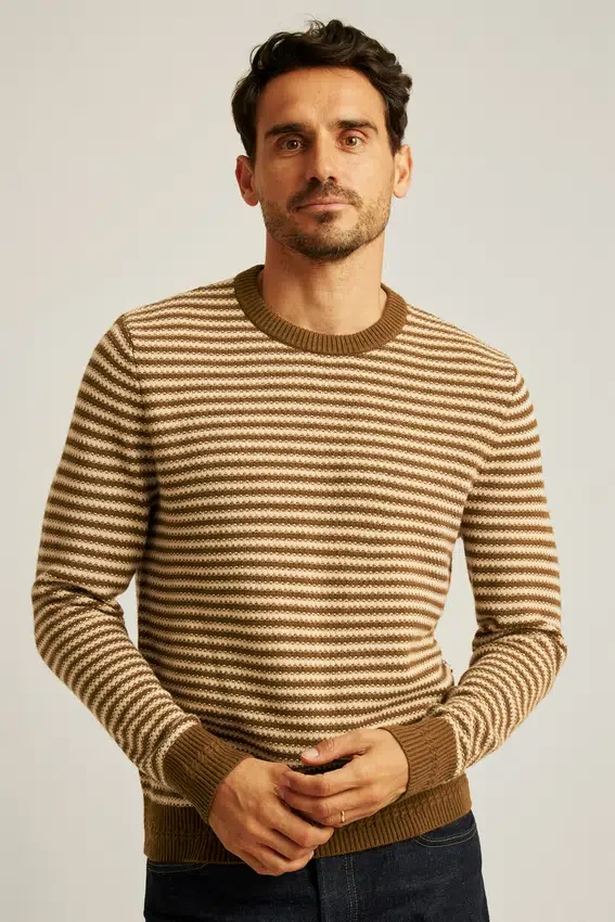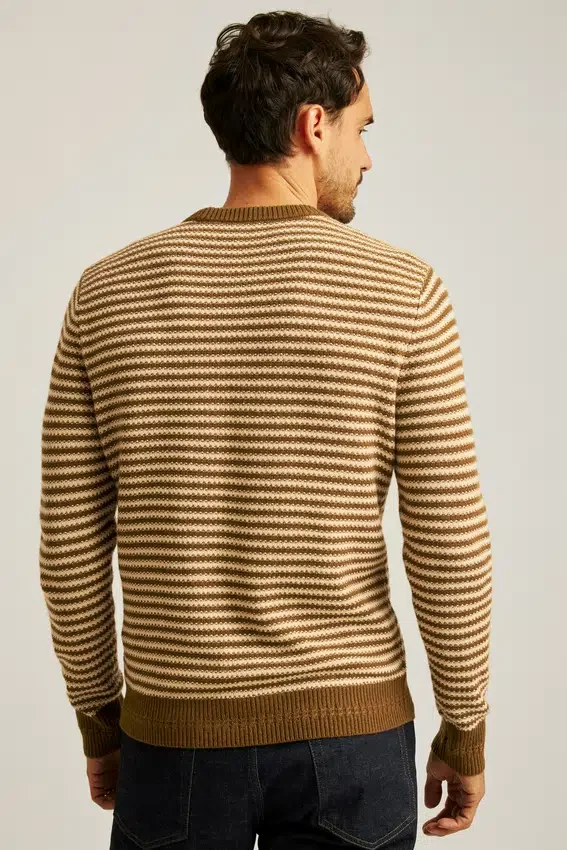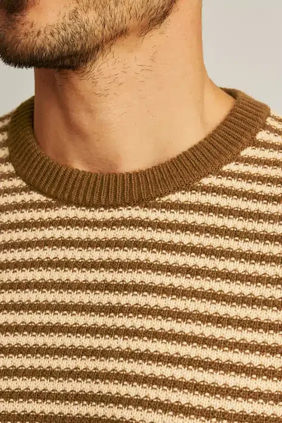 Filato misto morbido e avvolgente con righe tinte in filo in maglia a trama su tutta la superficie | Dettagli curati che includono maglia a treccia sui polsini e sull’orlo a costine, e un colore a contrasto all’interno del collo sul retro