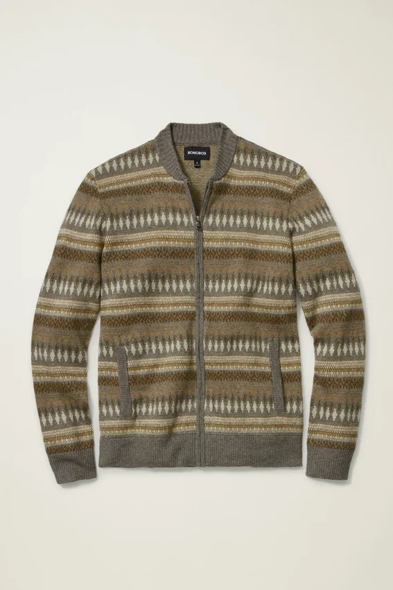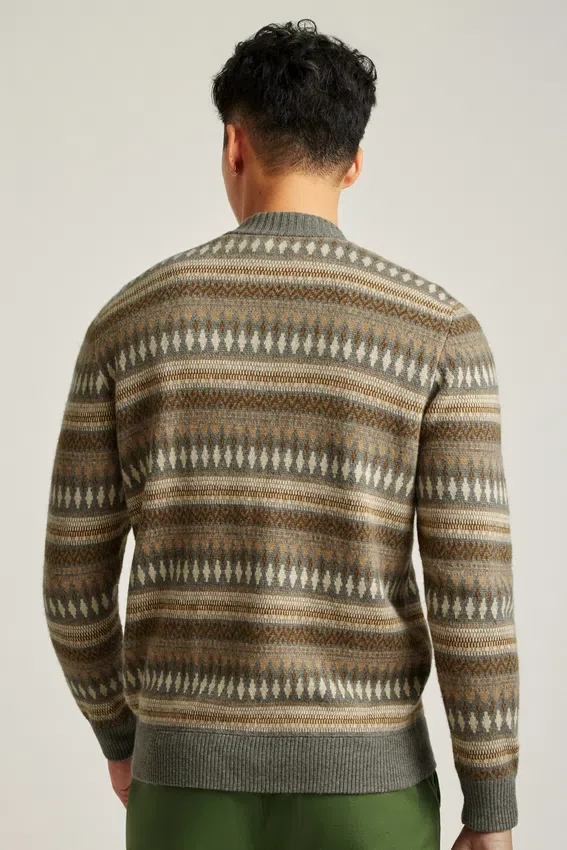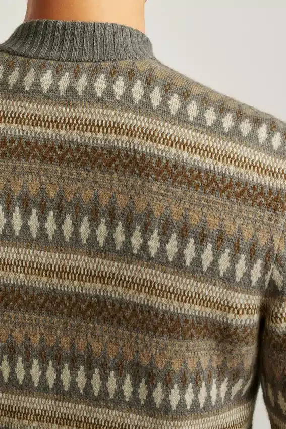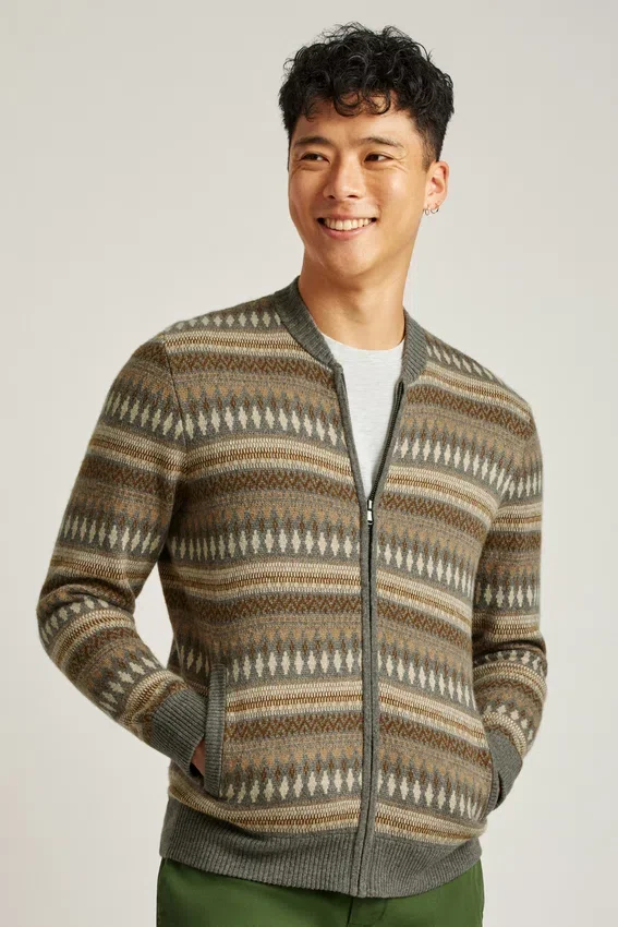 Filato misto morbido e confortevole con motivo Fair Isle dai colori neutri | Bordi a costine | Chiusura con zip integrale | Tasche