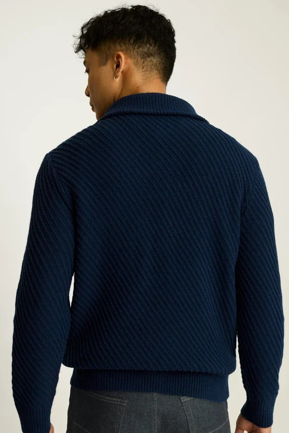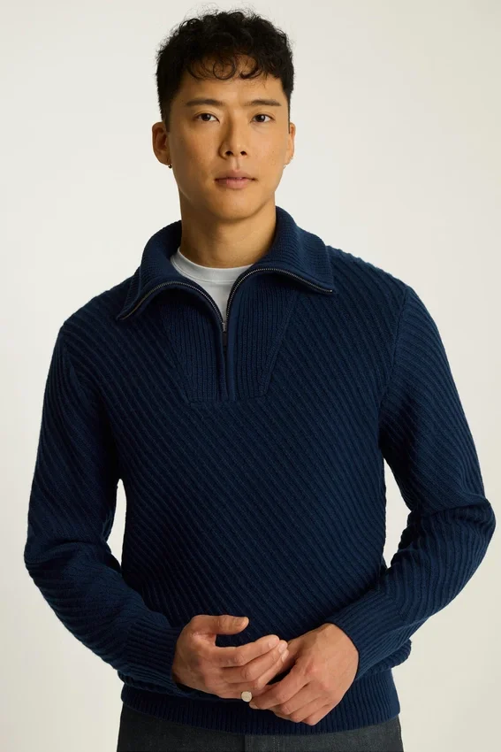 Filato misto merino morbido e caldo | Costine diagonali sul corpo e sulle maniche | Chiusura con cerniera sul collo | Collo a imbuto