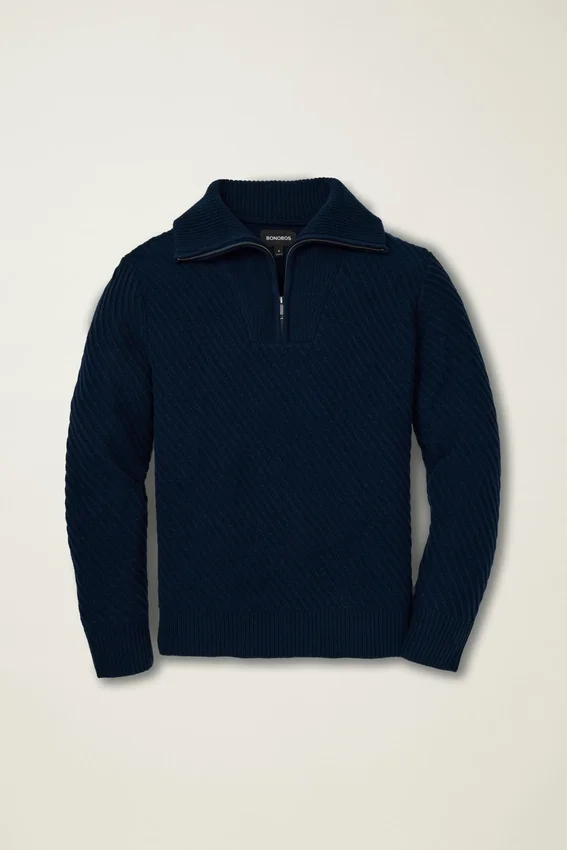 Resta al caldo con stile con il nostro maglione con colletto e mezza zip. Il suo design elegante e il tessuto morbido lo rendono ideale per ogni occasione. Scopri gli stili su Bonobos.