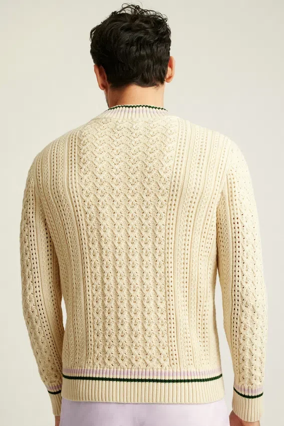 Filato misto cotone/cashmere super morbido. Maglia a trecce sul corpo e sulle maniche, con bordi a contrasto su scollo a V, polsini e orlo.