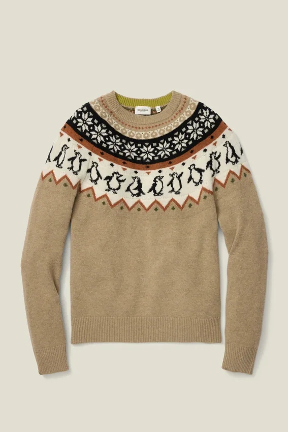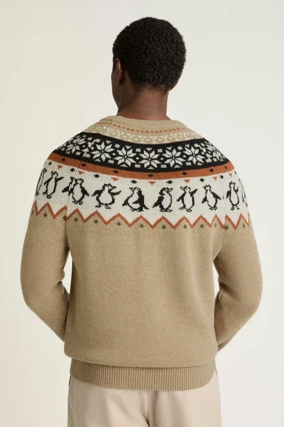 Il maglione Fair Isle Disco Penguin di Bonobos è il capo perfetto per distinguersi durante le feste. Un maglione da uomo per le feste con motivi giocosi e un calore avvolgente per le occasioni festive.
