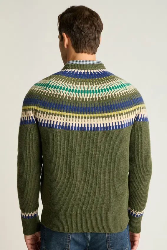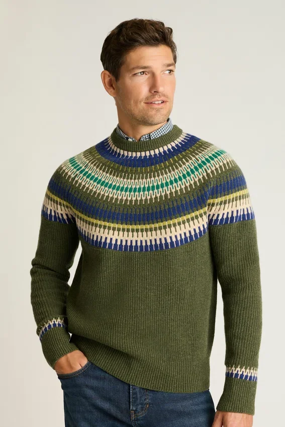 Filato misto merino morbido e avvolgente | Disegno Fair Isle originale | Bordi a costine | Maglia spessa
