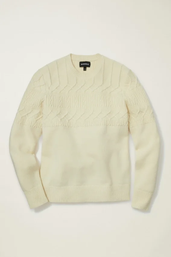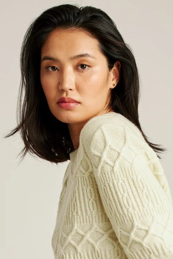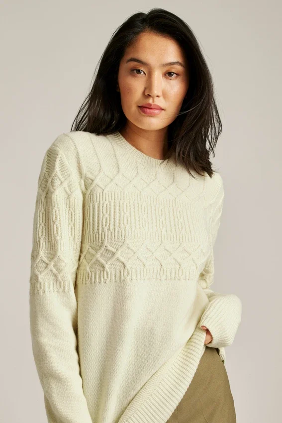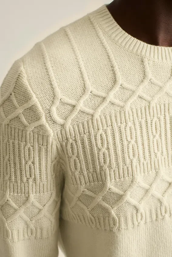 Morbido filato misto lana con lavorazione a trecce sulla parte superiore del corpo e sulle maniche | Jersey sulla parte inferiore del corpo e sulle maniche | Bordi a costine