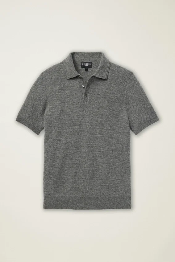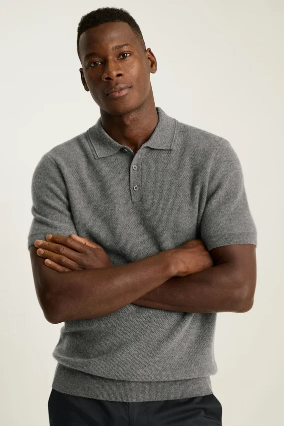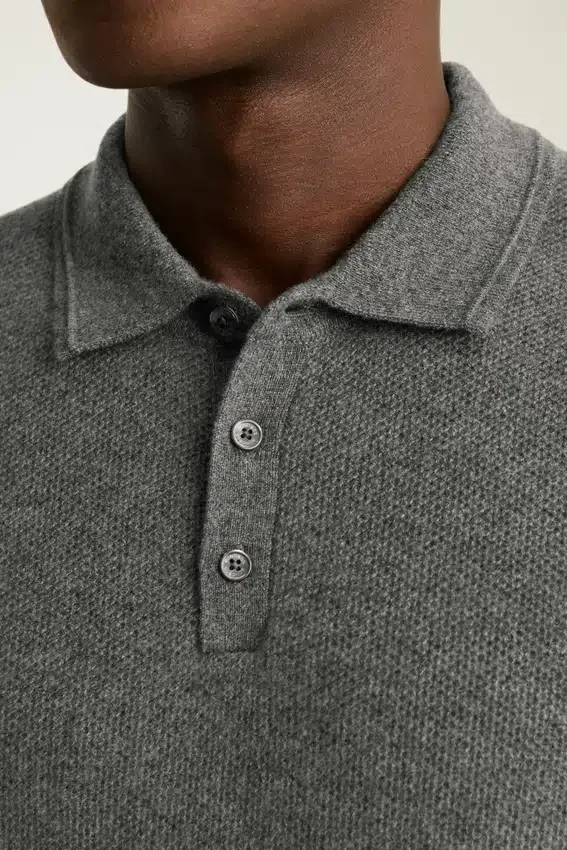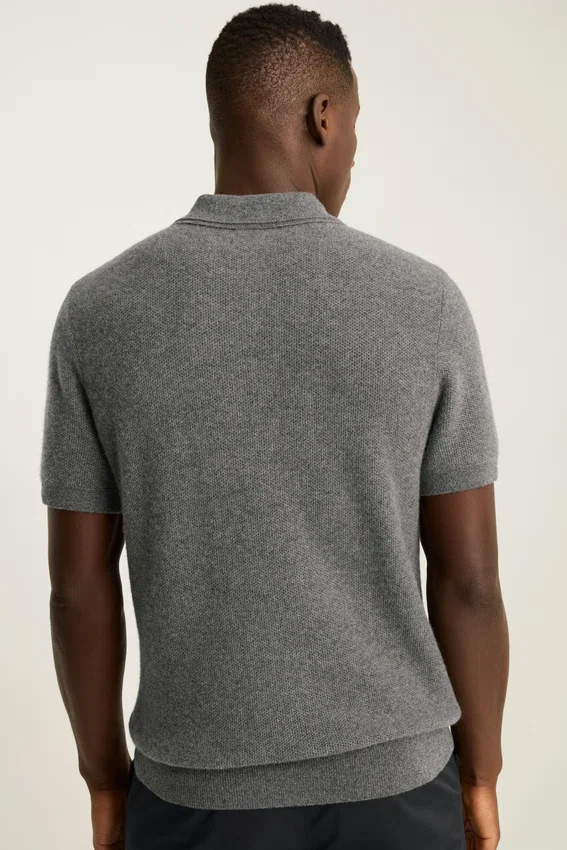Il filato di cashmere, morbidissimo e caldo, è il massimo del lusso | Punto a nido d’ape su tutta la superficie | Chiusura con bottoni | Maniche corte | Peso medio | Contenuto di cashmere riciclato per una maggiore sostenibilità