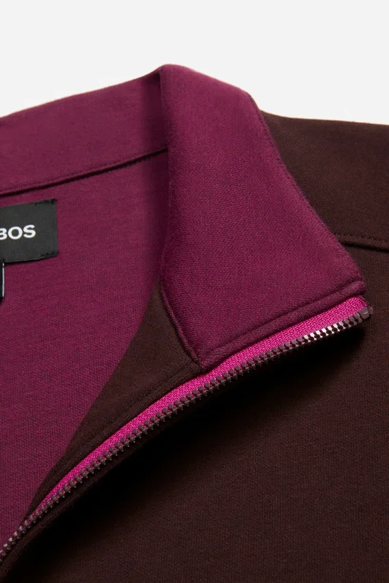 Tessuto double-face pulito e raffinato | Colore interno a contrasto | Cerniera gommata con nastro interno a contrasto | Tasche laterali con sacchetti in jersey