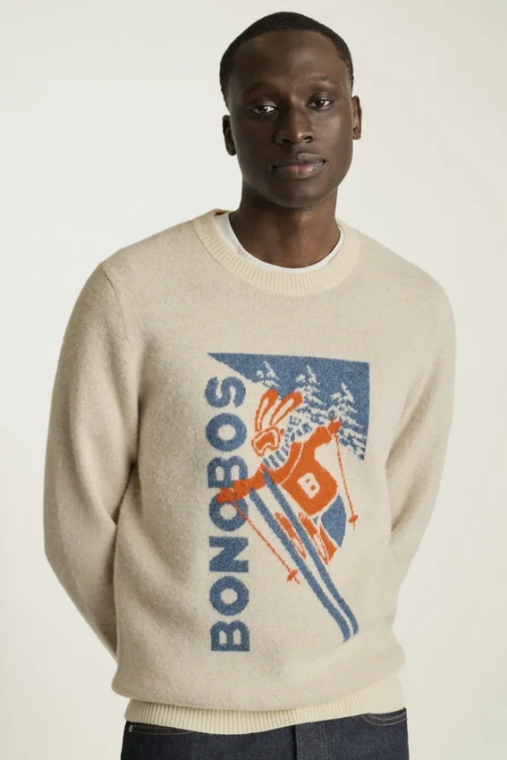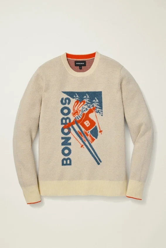 Rilassati con il nostro maglione Ski Bunny in lana merino extrafine, ispirato ai poster retrò. Perfetto per lo stile après-ski, anche se non vai sulle piste.