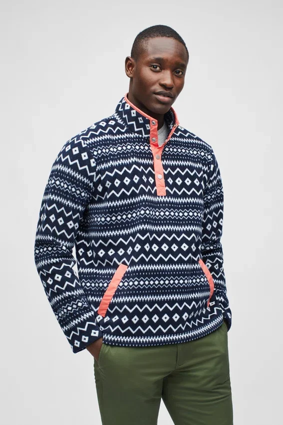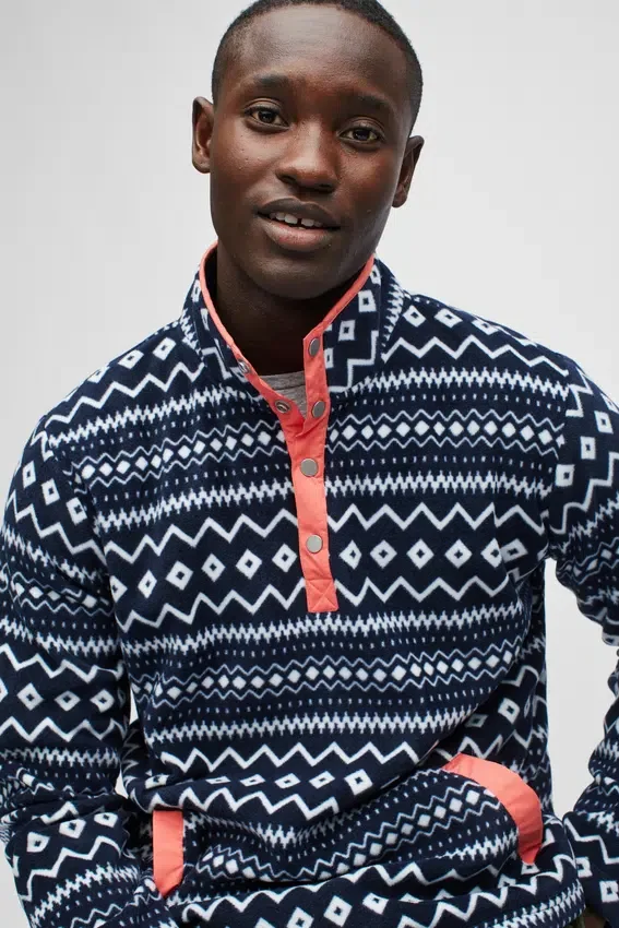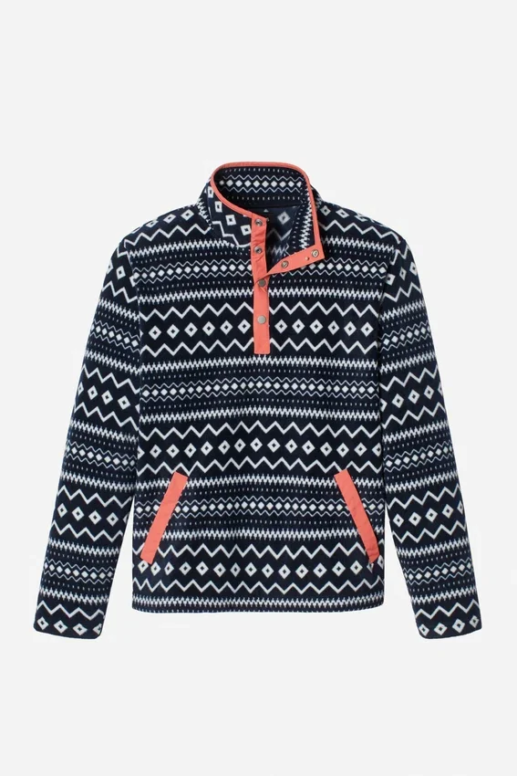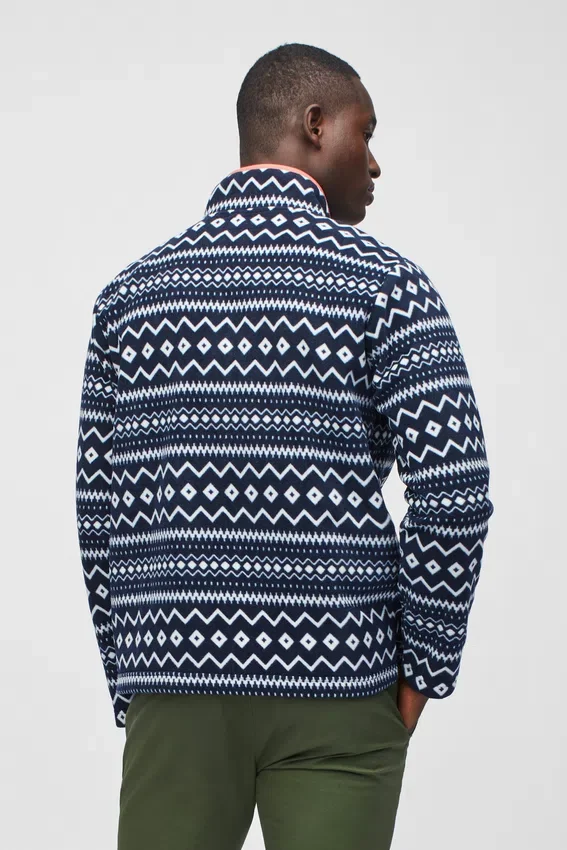 Morbido pile stampato con tasca a marsupio e bordi in tessuto a contrasto