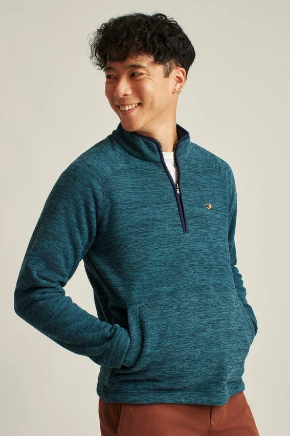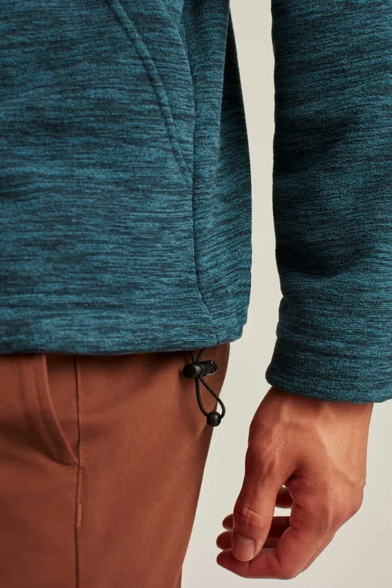 Pile polare spesso e confortevole con effetto jaspa | Cerniera sul collo a imbuto | Bordatura a contrasto | Tasca a marsupio | Cordino elastico nell’orlo | Ricamo originale sul petto