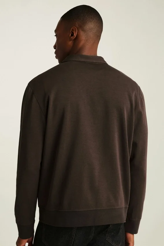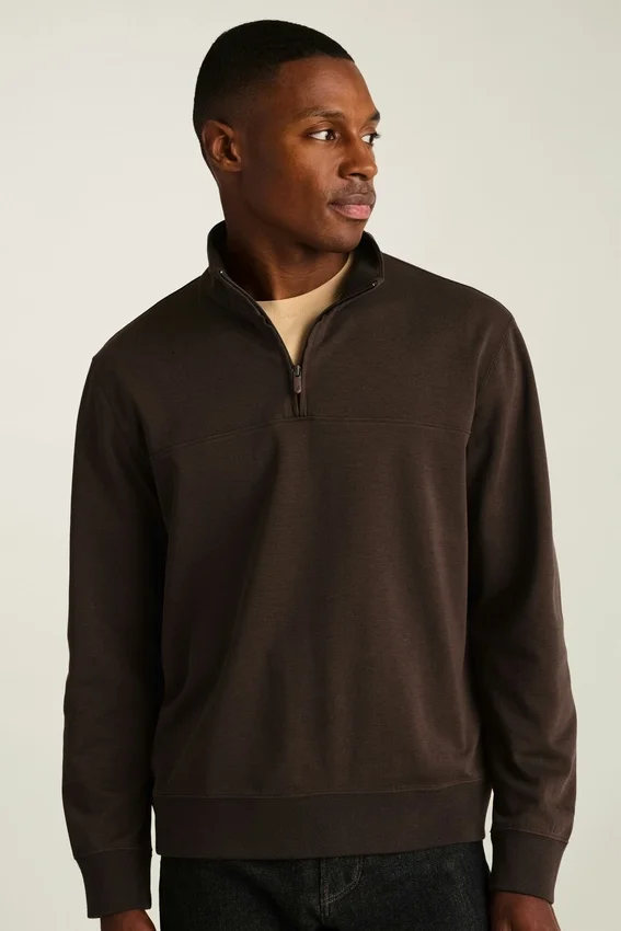 Tessuto di peso medio, morbido e liscio | Assorbe l’umidità | Collo alto con chiusura a mezza zip | Polsini e orlo a costine