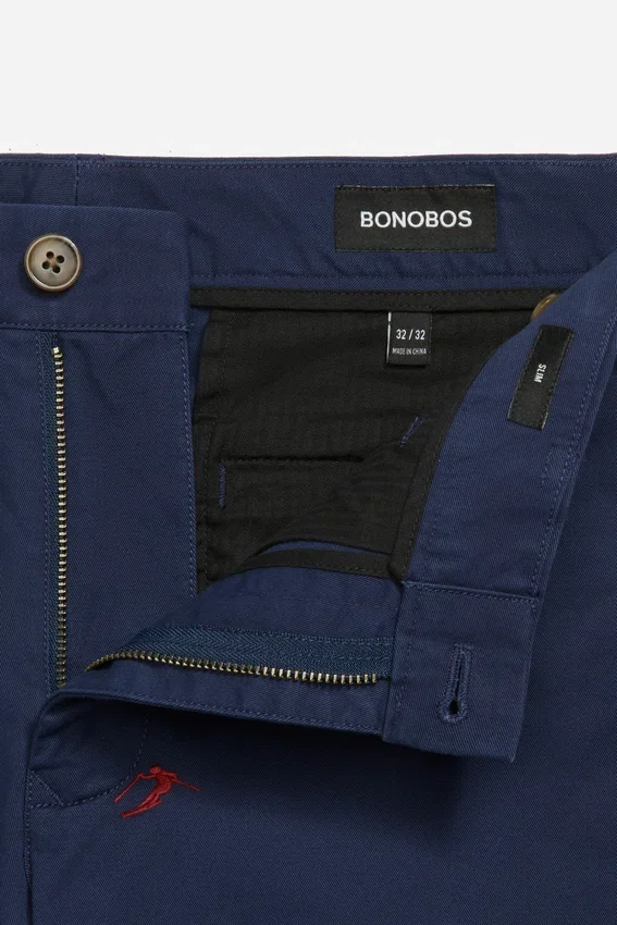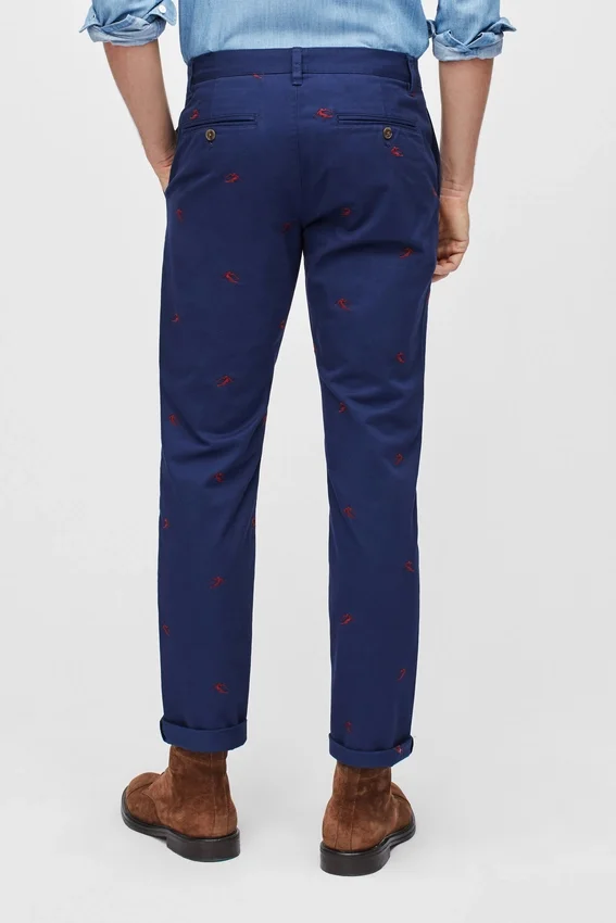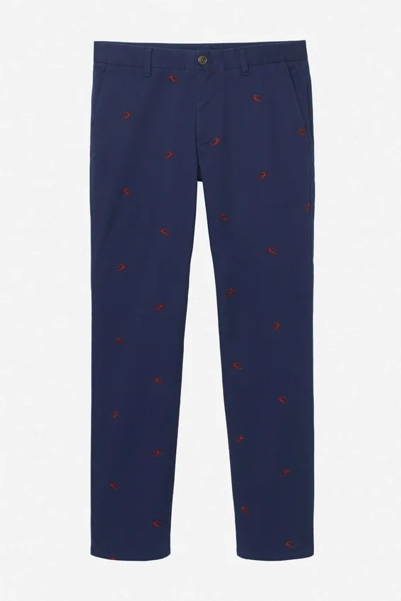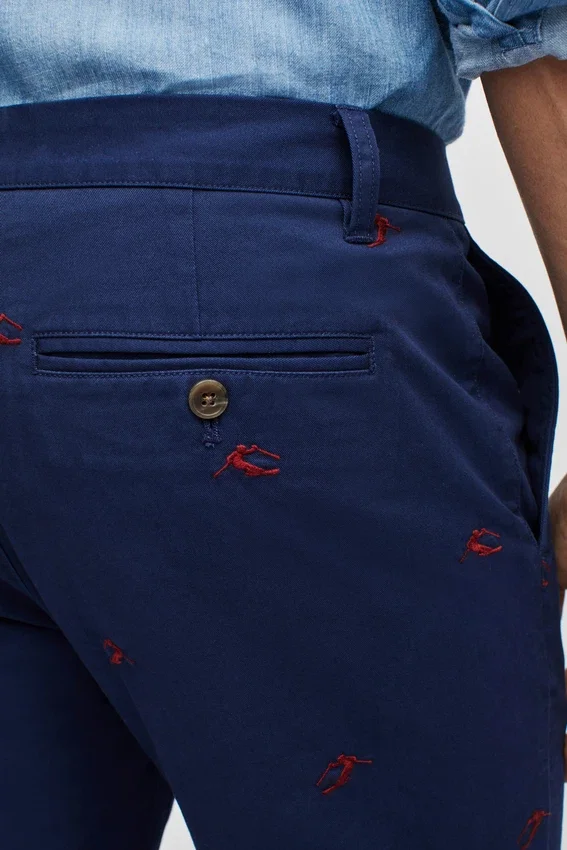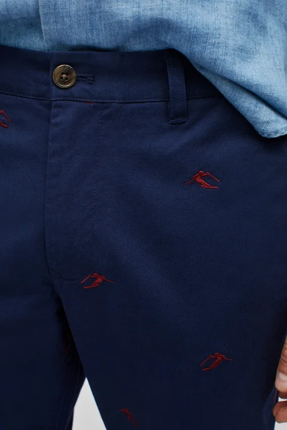 Motivi ricamati stagionali sul nostro tessuto Stretch Washed Chino | Curved Waistband | Tasche a spina di pesce nere | Chiusura con bottone a scatto italiano sul davanti al centro | Chiusura con cerniera e fermo | Bottoni sulle tasche posteriori