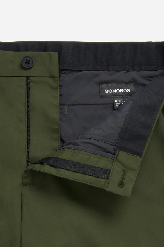 Caratteristica Curved Waistband Bonobos con chiusura a bottone sul davanti al centro. Elastico spazzolato all’interno della cintura per il massimo comfort. Tasca posteriore destra con chiusura a cerniera, tasca posteriore sinistra con chiusura a bottone a pressione nascosta.