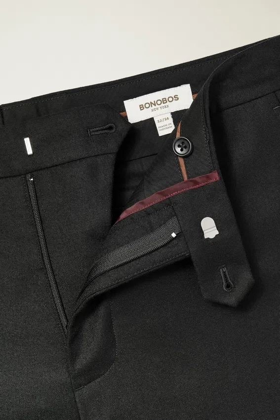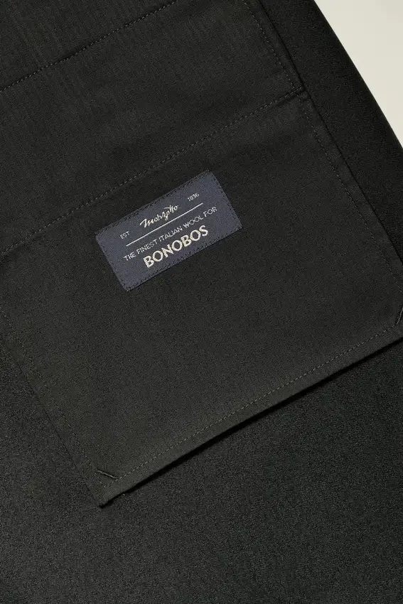 Tessuto Marzotto | Chiusura con linguetta sul davanti | Patta con cerniera | Tasca portabiglietti | Tasche oblique con cuciture a punto croce | Fodera sulla parte anteriore della gamba