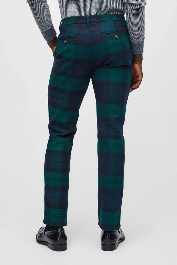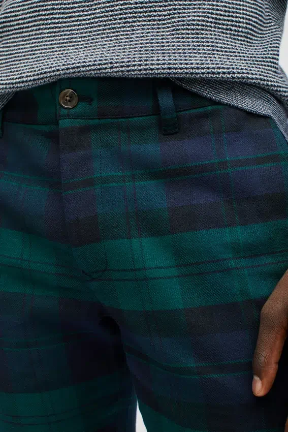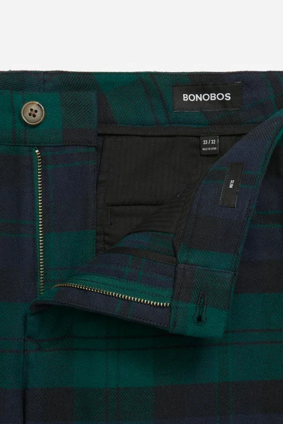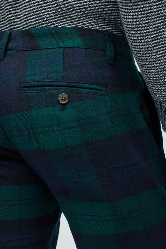 Tessuto tinto in filo con elasticità per un comfort e una libertà di movimento extra | Curved Waistband caratteristica | Tasche a spina di pesce nere | Chiusura con bottone a scatto italiano sul davanti al centro | Chiusura con cerniera e fermo | Bottoni sulle tasche posteriori