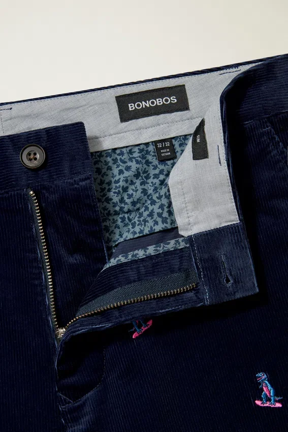 Lussuoso tessuto in velluto a coste di produzione italiana | Peso adatto a tutte le stagioni | Fascia in vita sagomata con pannello interno | Chiusura frontale con linguetta estensibile e bottone | Tasche posteriori a filetto con bottoni | Taglietto al centro della schiena