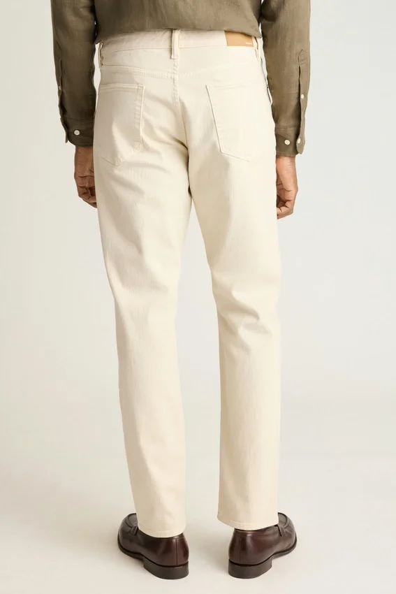Cotone extra elasticizzato | Tinto in capo | Modello a 5 tasche | Curved Waistband distintiva | Accessori in metallo di provenienza controllata | Toppe in carta con marchio certificate Oeko-Tex e FSC