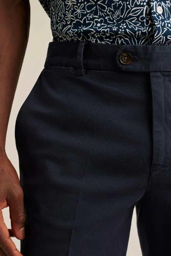 Tinto in capo per una maggiore morbidezza | Lussuoso tessuto di produzione italiana | Fascia in vita sagomata esclusiva | Chiusura frontale con linguetta estensibile e bottone | Tasche posteriori a filetto con bottoni