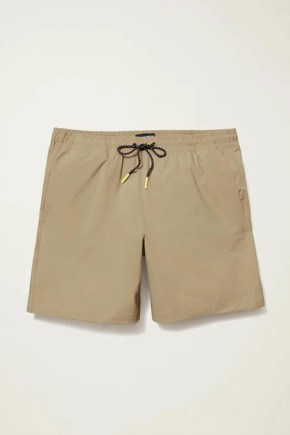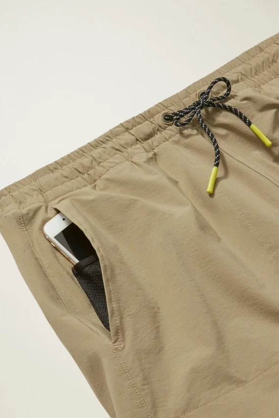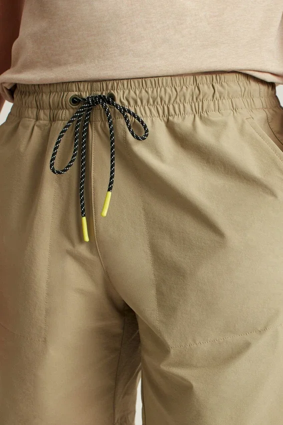 Cintura elastica | Cordino con bordino a contrasto e occhielli | Tasca posteriore con tiretto della cerniera a contrasto | Tasche interne in rete | Tasca nascosta e sicura per dispositivi multimediali