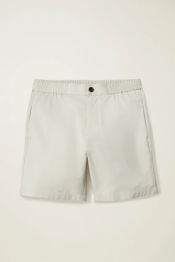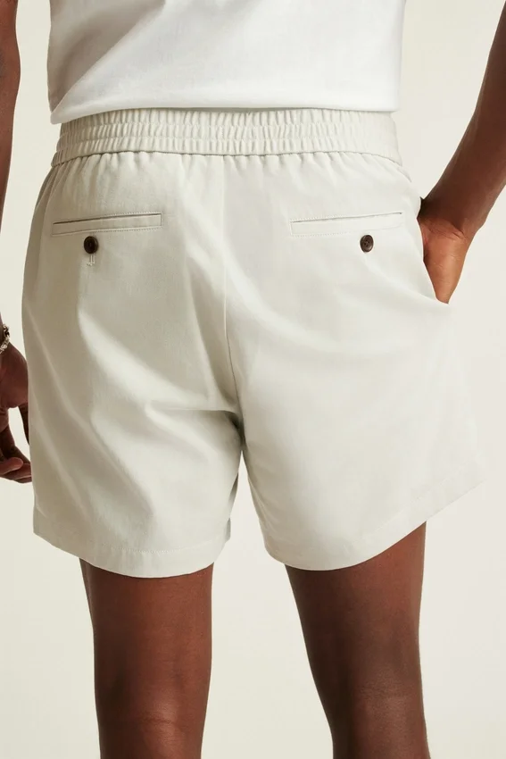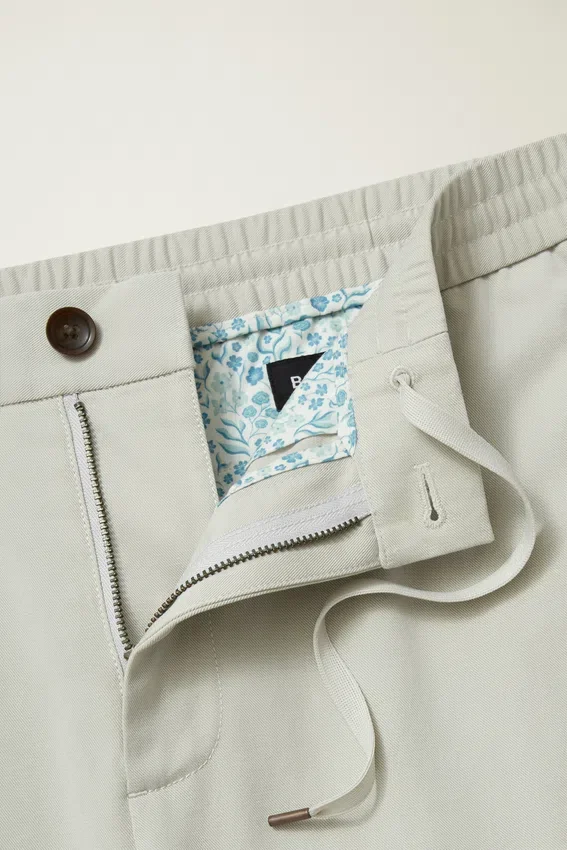 Cintura elastica ibrida | Tessuto misto Tencel + cotone | Cordino interno in maglia piatta | Chiusura frontale con bottoni | Tasche posteriori a filetto con chiusura a bottone