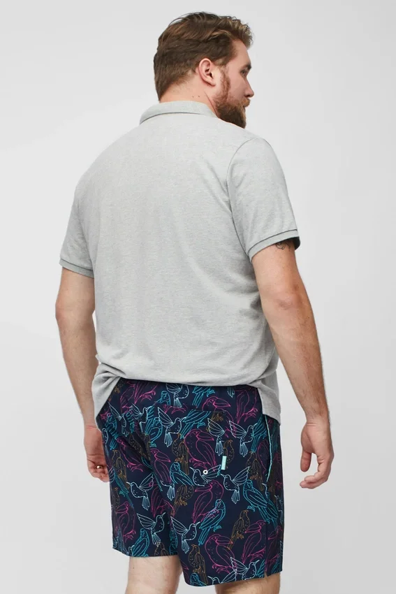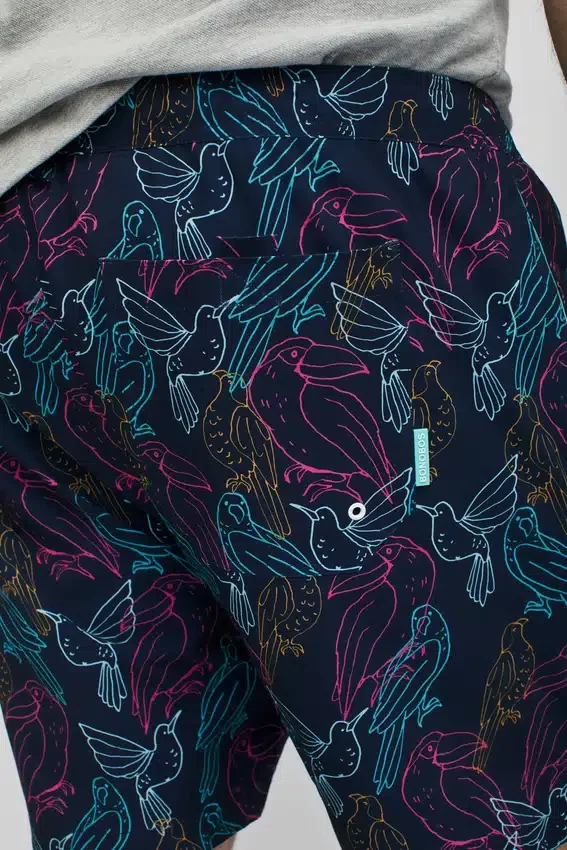Cintura elastica con cordino esterno | Fodera interna in rete | Tasche sulle cuciture | Tasca posteriore applicata con chiusura a strappo | Contrasto su cintura interna, sacchi delle tasche e gancio portachiavi | Stampa esclusiva