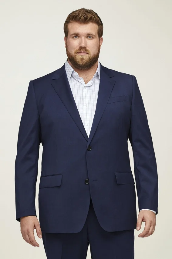 Il modello è alto 198 cm con un torace di 127 cm e indossa una giacca da completo 50L.