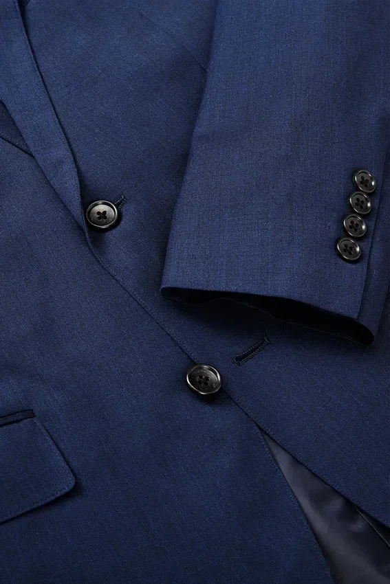 La giacca presenta revers moderni. È dotata di doppia abbottonatura, doppio spacco, polsini con bottoni non funzionali, fodera in Bemberg e una tasca interna per il passaporto, ideale per i viaggi. I pantaloni presentano una classica chiusura con gancio e barra e tasche posteriori con bottoni.