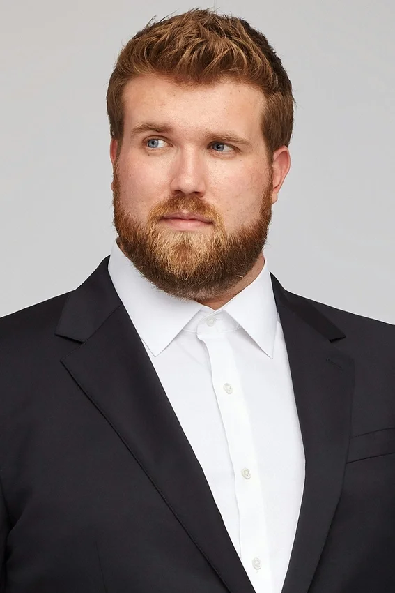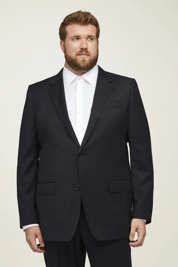 Il modello è alto 198 cm con un torace di 127 cm e indossa una giacca da completo 50L.