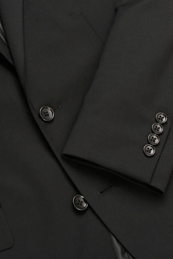La giacca presenta revers moderni. È dotata di doppia abbottonatura, doppio spacco, polsini con bottoni non funzionali, fodera in Bemberg e una tasca interna per il passaporto, ideale per i viaggi. I pantaloni presentano una classica chiusura con gancio e barra e tasche posteriori con bottoni.