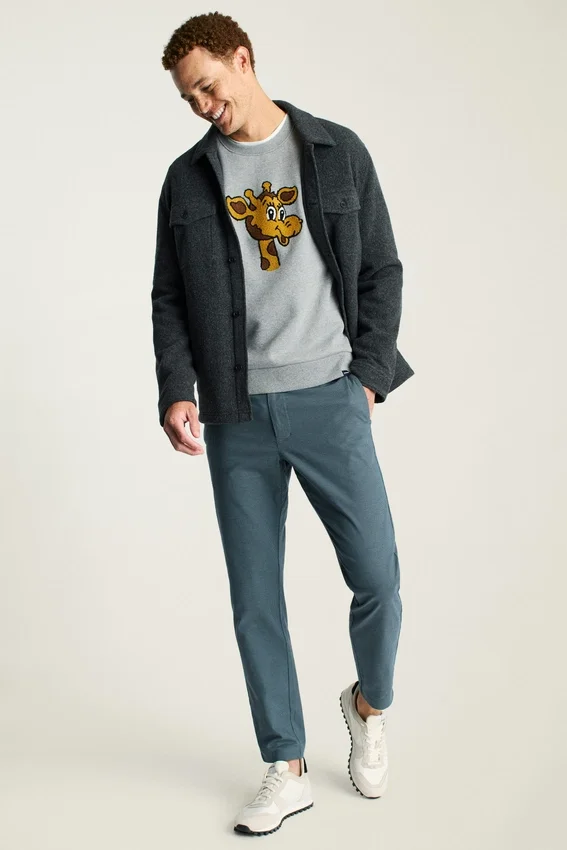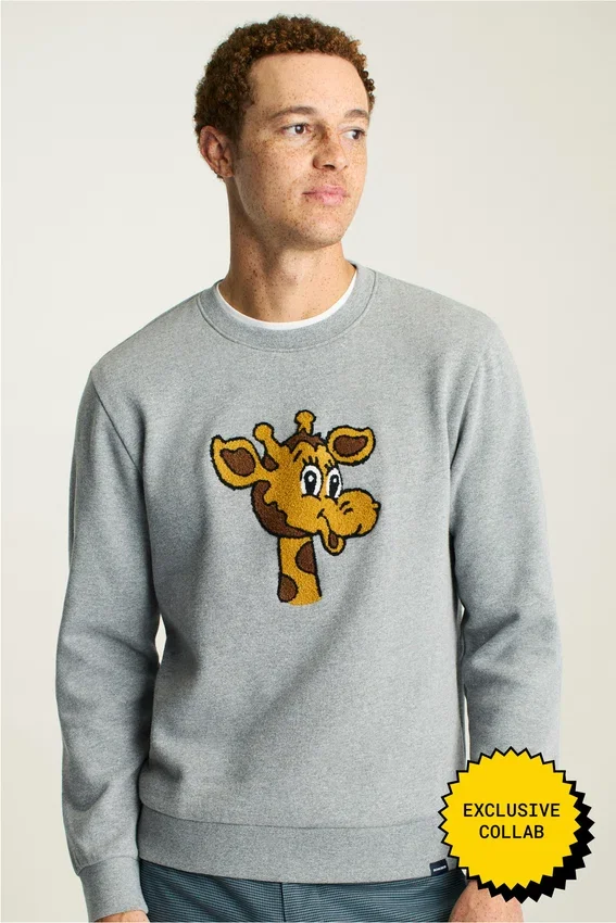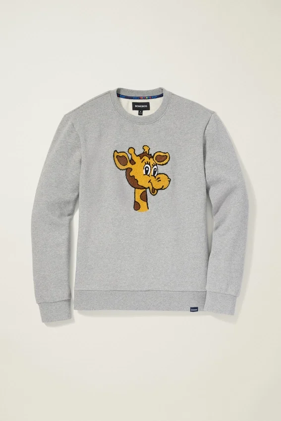 Morbido pile con Geoffrey ricamato in ciniglia | Nastro sul collo Toys”R”Us Kid | Etichetta tessuta Bonobos X Toys”R”Us sull’orlo (sollevare l’orlo del maglione per leggere “I’m a Toys”R”Us Kid”)